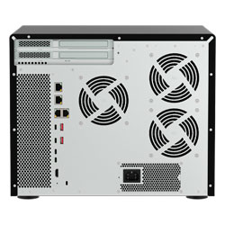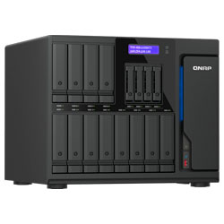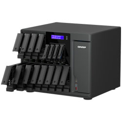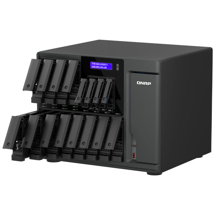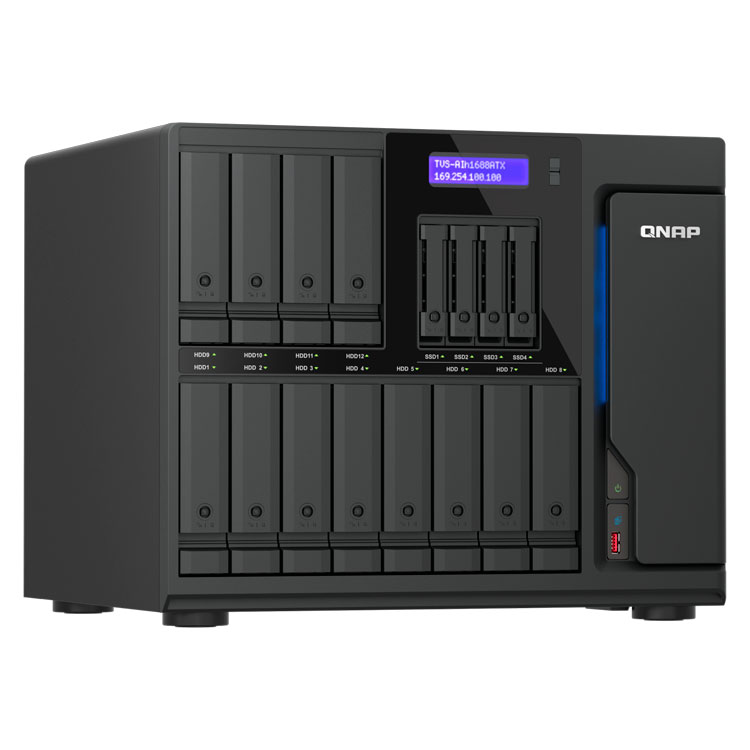 Storage NAS híbrido desktop com 16 baias hot swappable sen do 12 para instalação de HDs SATA 3,5 polegadas e 4 baias 2,5 polegadas para SSDs SATA, processador Intel Core Ultra 7 8-Core, 32GB de memória DDR5 ECC, 2 portas 2,5GbE, 2 portas 10GBASE-T e 3 slots PCIe. Solução de armazenamento de alto desempenho ideal para servidor de arquivos, virtualização e IA.